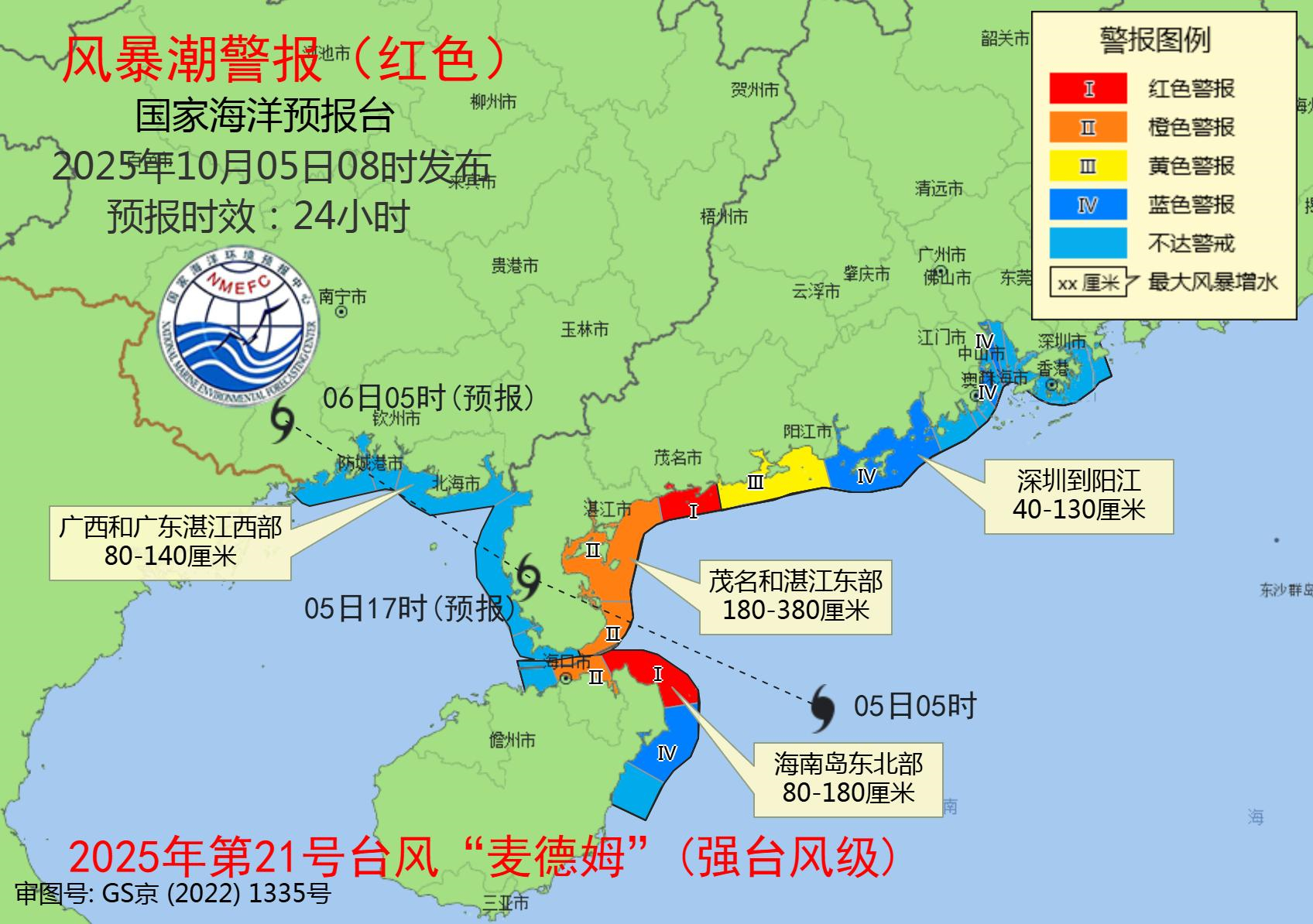 10月5日,中国新闻社。根据国家海洋的预测网站,国家海洋预测站因快速降雨和海浪发出了红色警报。图像来源:国家海洋浇水站的网站国家海洋浇水站已根据“海洋灾难紧急计划”发出了红色警告,警告头晕风暴。年度第21台台风“ Medham”(台风的强大)将看到深圳沿岸的风暴从10月5日上午至6月上午出现在整个质子中,而广东可以看到沿风暴海岸的风暴180-380 cm。伊斯拉·德·海南(Isla de Hainan)的东北海岸出现了80-180厘米的风暴,而广州海岸和广东江河的西海岸出现了80-140厘米的风暴。风暴警告在妈妈,广东和海南市旺庄市的水平是红色的,海琴市是杭江市头晕风暴的警告水平,haikou City是橙色,是橙色市的开朗警告水平。根据情况,高潮警报将在10月6日下午取消。海水在Haomin市的海水流动风险,Hainan省Hainan省,Hainan省,北部亨坎市,Hylan市,Hylan市,Hylan,Meylan,Meylan,Meylan,Meylan,Meylan,Moomin,Moomin,Moomin,Haomin和Haomying and Haomying and沿海地区。乌丘安市沿海反流的风险,波托区,奇坎区,奇坎区,木汉区,徐汉区,Xuwen区,Xuwen地区的Lightts River City,Xuwen区,奇坎山区,奇坎地区,奇温区,Xuwen区和海水地区的风险,沿海地区的风险十二区。国家海洋预测站雷明DS沿海政府和相关部门进行紧急救援行动,以防止雨水玛格斯并根据责任解决海水的回流。低地沿海地区和危险房屋的居民必须及时搬到安全区域。移民工人和游客必须组织以撤离沿海地区危险地区的危险区域,浴室和娱乐活动,并禁止人员参观海滩。钓鱼船,渔船和其他海事工人对IMRI的调查,以避免危险。图像来源:Océano国家站的网站Drying National Pherean Treecast Station已根据“海洋灾难紧急计划”发出了Akawaki警报。年度第21台台风“ Medham”(强大的台风)导致了从10月5日上午到南中国海西北6-10米的早晨,巨大的3-5米,造成NE造成NE的狂野浪潮。Arby气缸成为Orangell。在广州东部和海南东北部的野波中出现了4-6米的波浪,而2.5-4米的大波浪在广州东南部附近的海岸附近的水域和西北地区附近的海水中变成了大波浪,海水附近是海水的黄波。国家海洋预测站提醒我们,在海洋先前地区运营的船只将采取安全预防措施,相关的沿海力量将提前采取措施预防和避免这种情况。 48-预报:预计将在10月6日中午提高波浪警报,具体取决于情况。